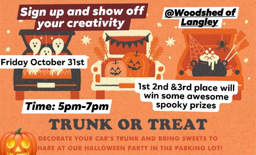 Itβs time to sign up and show off your creativity at this yearβs Trunk or Treat at the Woodshed of Langley! Decorate your trunk, bring the treats, and join us for a Halloween party like no other β right in the parking lot!