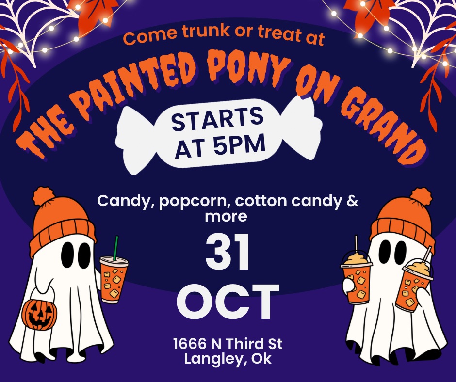 Get ready for a spooky and sweet evening at The Painted Pony on Grand! Dress up in your Halloween best and join us for an exciting Trunk or Treat event filled with goodies, giggles, and ghostly fun.