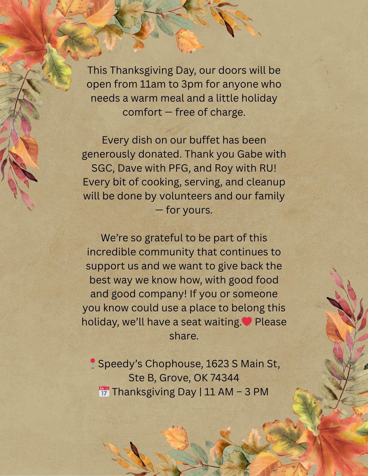 This Thanksgiving Day, Speedy’s Chophouse is opening its doors to anyone in need of a warm meal and a little holiday comfort — completely free of charge.